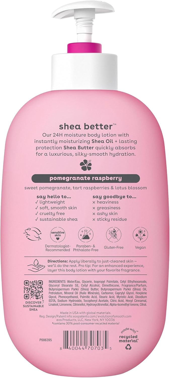 Our bright and juicy Pomegranate Raspberry scent contains fragrance notes of sweet pomegranate, tart raspberries and lotus blossom. eos 24-hour hydration body lotion is made with natural ingredients to leave your skin smooth from head-to-toe.
