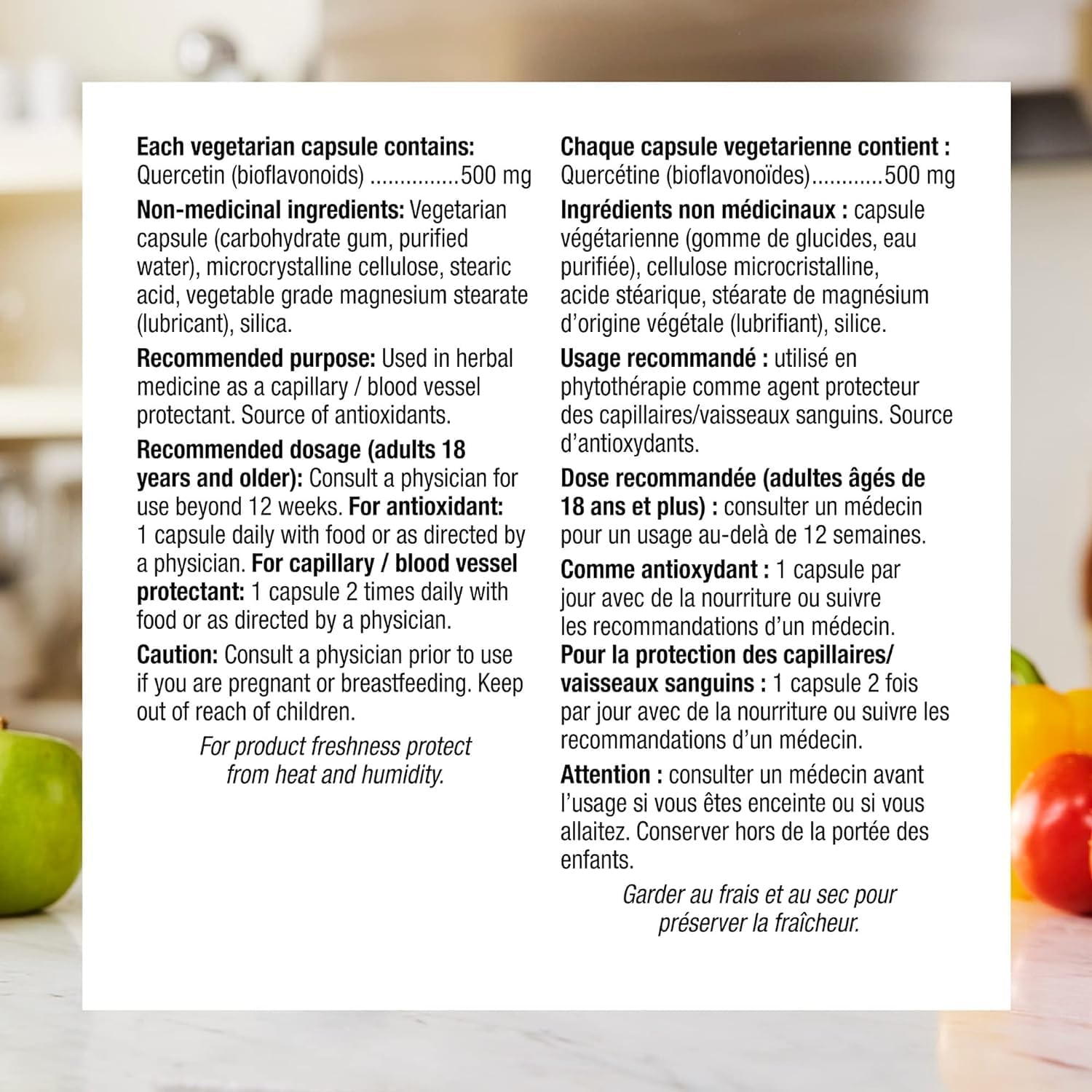 Quercetin 500 mg from Webber Naturals contains a concentrated source of the bioflavonoid quercetin in easy-to-swallow vegetarian capsules. Quercetin is used in herbal medicine to protect blood vessels, including the capillaries. It also provides a source of antioxidants to help your body neutralize the free radicals responsible for oxidative damage.